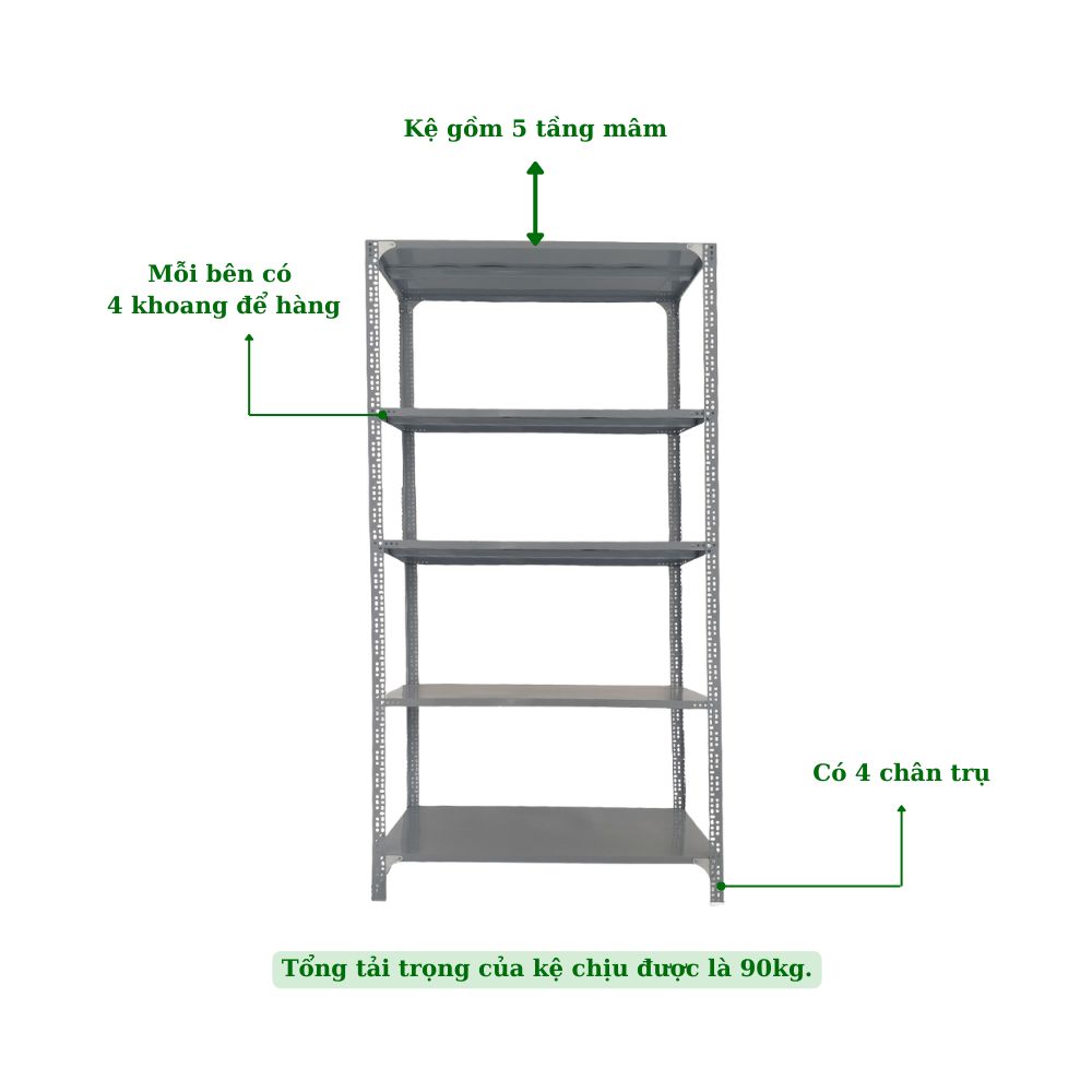 Kích thước kệ có thể được lắp ghép tùy theo nhu cầu đựng hàng hóa. Tuy nhiên, mâm sàn kệ đa phần được sản xuất theo tiêu chuẩn: 30, 40, 50, 60cm.