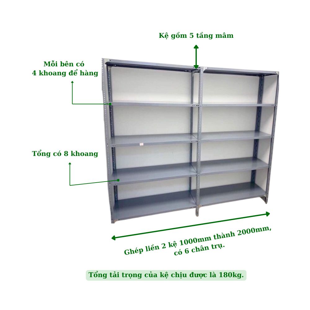 – Kệ gồm 5 tầng mâm, mỗi bên có 4 khoang để hàng, tổng có 8 khoang, ghép liền 2 kệ 1000mm thành 2000mm, có 6 chân trụ.