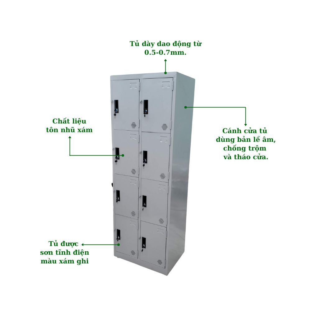 – Chất liệu tủ sử dụng là tôn nhũ xám, tủ dày dao động từ 0.5-0.7mm.