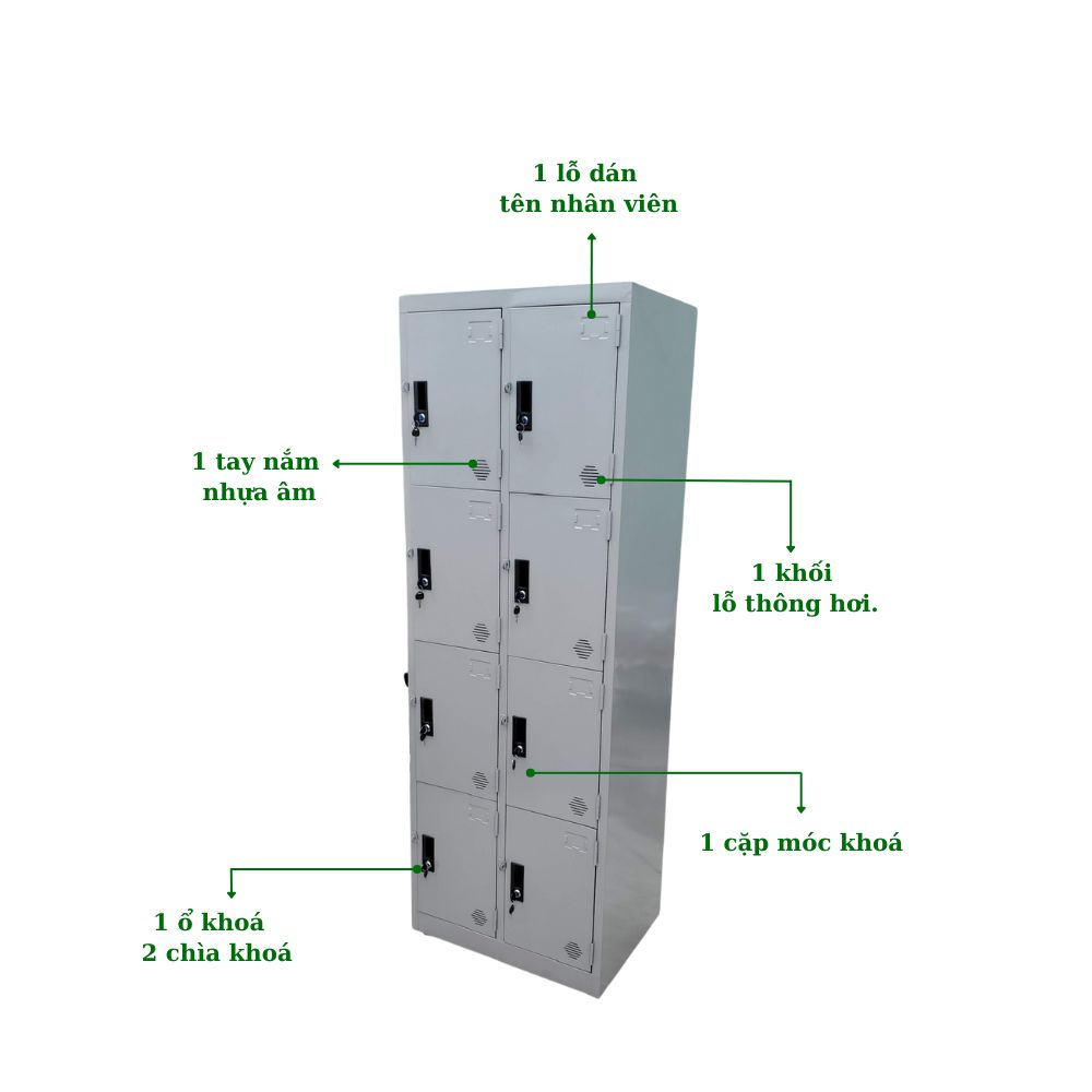 – Tủ có phụ kiện gồm có 1 tay nắm nhựa âm, 1 ổ khoá với 2 chìa khoá, 1 cặp móc khoá phụ, 1 lỗ dán tên nhân viên, 1 khối lỗ thông hơi.
